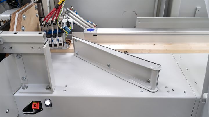 A munkadarabrögzítés opcionális terelőlemezből és nyomógörgőből áll. Az oldalsó terelőlemez biztosítja a munkadarabok beigazítását és előfeszítését, így mindig tökéletes vágás érhető el. A kimenetnél lévő elfordítható oldalsó nyomógörgő a fűrészlap után a munkadarabot az ütközőhöz nyomja, így biztosítva a pontos derékszöget még az utolsó vágásoknál is.